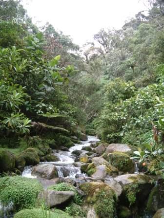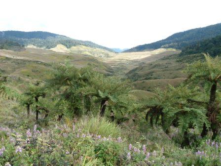 ゴロカからチンブーへ抜けるこのコースは古来から人々の物々交換の交易ロードとしても知られています。 人々にとって今でも利用されているのにもかかわらず、自然がそのまま残っている珍しいところです。そこには、自然の豊かさととも、 自然と調和して暮らす人々の姿が窺がえます。高地の深い熱帯雨林、標高3000を超えていくコースの途中では、珍しい野性のランなども豊富。 また、運がよければ、道の途中で村人が捕って来たカスカスという野生動物を料理した夕食が振る舞われることもあります。山小屋で一泊した後、 早朝少し下っていけば、そこにはステファニーアストロピアと呼ばれるゴクラクチョウが見られるバードウォッチングポイントがあります。 その後さらに下ると、広大な草原が出現します。シダ植物がポツポツとキノコのように生えているのがまた趣があって、 まるで恐竜でも現れるのではないか、と思われるほど。第2次世界大戦時に日本兵も隠れていたと言われるように、 日本人にも関係の深い場所であったようです。