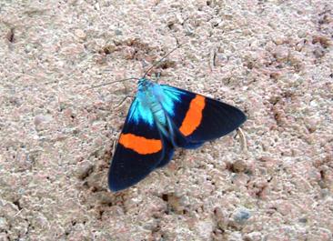 触覚の特徴や止まったときの羽の置き方からすると蛾です。でも色合いがとてもきれいでとても蛾とは思えません。