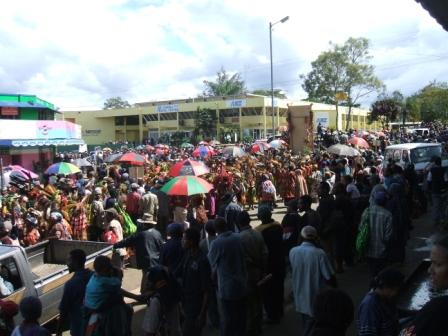 みなさん、こんにちわ!ゴロカトレック&ツアーズです。昨日は、統一選挙の立候補締め切りの日! パプアの選挙はスゴイと聞いていましたが、これほどまでとは・・・・・・。立候補者を交えて、街の中をパレードです。 決して暴動ではありませんのでご心配なく!そんなわけで、数日前から、 シンシングループやブラスバンドなどのグループが街の中を練り歩き、まるでゴロカショーが来たかのような賑わいです。