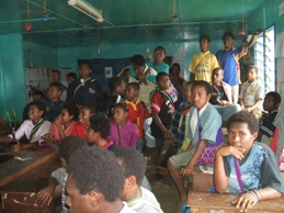 こんにちは、ゴロカトレック&ツアーズです。先日は、 日本から来られたクラブツーリズムのみなさんとゴロカ市内の小学校に行ってきました。この学校の生徒数は、 現在3年生から8年生までで約880名います。ここは、パプアニューギニアの中でも非常に珍しく、 目の不自由な生徒や耳の聞こえない生徒も一緒に健常者と一緒に授業を受けています。この学校の近くには、 全国から身体の不自由な生徒を受け入れ、特別指導を行っているキリスト教の施設があり、そこと協力関係にあります。ある意味、 小さいことから自然に助け合う気持ちを学べる意味ではとてもうらやましい環境です。いくつかクラスを覗かせてもらいましたが、 そこでは、生徒たちの歓迎の歌で迎えられました。