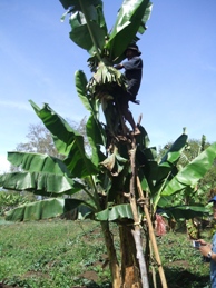 村の長老が、これは俺のバナナなんじゃ、言いながらバナナの草?に登って、 大きくなったバナナの実を葉っぱで巻いてました。こうすることによって、バナナを虫や鳥から守るということと、 早く熟することの2つの利点があるということ。バナナの葉っぱが枯れだしたら収穫できるのだそうです。 これはスペシャルバナナだから、そこらの衆にはあげんわい、と強気の長老でした。