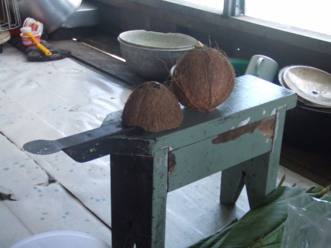 木製の小さな椅子に金属の刃がついただけの簡素な道具ですが、ココナッツを削るときに大活躍。
